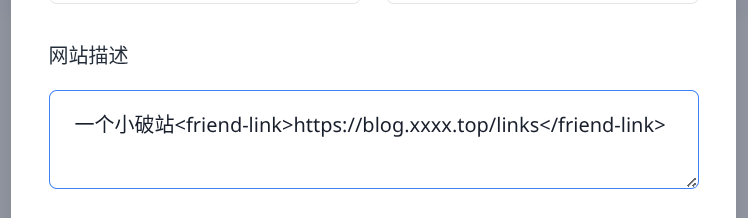 ↑点击提交,可以的情况下,希望您能在网站描述的末尾添加形如<friend-link>https://blog.xxxx.top/links</friend-link>的友链页面链接,这样可以让我更加方便的检索双向友链,如下图: